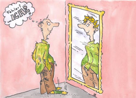 Selbstbild/Fremdbild(12/2006)Autoren: Michael Hoberg/ Hans-Peter KasüschkeCartoon: Sabine Gruchmann-SchneiderSelbstbild und Fremdbild sind als solche keine originären Begriffe der Individualpsychologie, sondern werden erst bei ihrer Weiterentwicklung durch z.B. Rogers und Watzlawick eingeführt. Selbstbild bezeichnet das Bild, das ein Mensch von sich selber hat, von seinen Eigenschaften, seinen Fähigkeiten, seinen Fertigkeiten, seinem Wert, wobei es auch das Wunschbild oder Idealbild von sich selbst umfasst, also „wie und was bin ich, wie und was würde ich gerne sein“.Fremdbild bezeichnet das Bild, das andere von einem haben, d.h. wie andere Personen einen Menschen einschätzen hinsichtlich seiner physischen und psychischen Äußerungsmerkmale sowie seinem Ansehen. Dabei entwickelt sich das Fremdbild nicht nur im direkten Bezug zum anderen, sondern kann schon im Vorfeld, durch generelle Vorurteile oder vom „Hören-Sagen“, bestimmt werden.Da sich der Mensch grundsätzlich sein Bild erhalten möchte, wirkt dieses wie ein Filter seiner Wahrnehmung, welcher das durchlässt, was den betreffenden darin bestätigt. Der Mensch verhält sich entsprechend seines Selbstbildes und die Umgebung handelt entsprechend ihres Fremdbildes von der betreffenden Person.Je größer nun die Unterschiede zwischen diesen beiden Bildern sind, um so größer ist die Gefahr, dass sich im Umgang miteinander Konflikte ergeben. Dies wird noch verstärkt, wenn Selbstbild und Wunschbild des betreffenden stark voneinander abweichen. Auch hier ist der Mutpegel von entscheidender Bedeutung bei der Bereitschaft, auch andere Sichten zuzulassen.